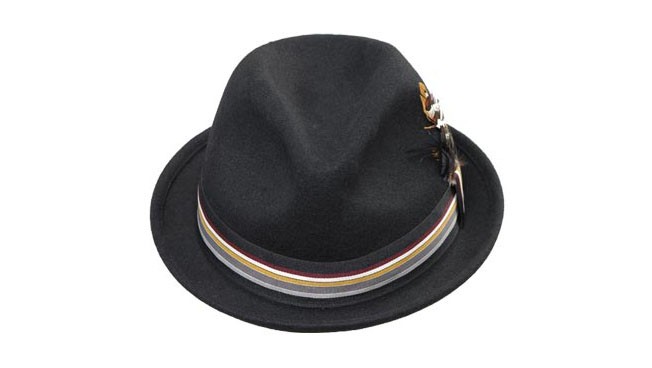 100%純羊毛的帽子,爵士帽的款式,用羽毛和亮眼的條紋裝飾顯得既時尚又隨性。